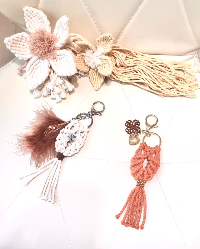マクラメ結びでお花を作りました。 カゴバック やデニムバッグ、キャンパスバッグなどに付けて頂けると、ポイントになり華やかになるかと思います。 長さが少し長いなーと思ったら、お家にあるハサミで切ってみて下さいね。