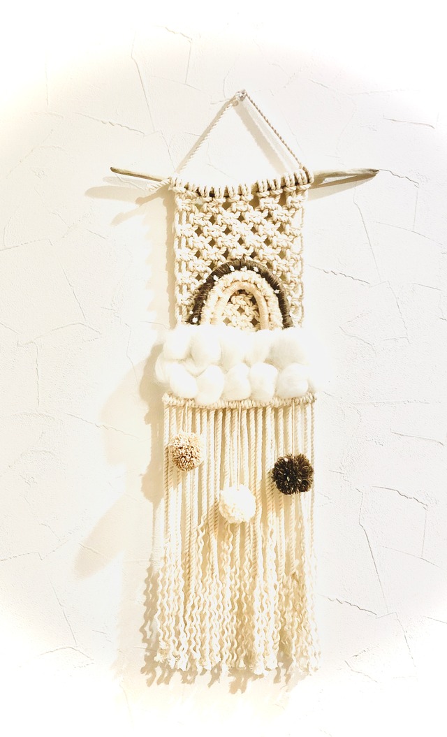 マクラメタペストリーに、今外国で幸せのシンボルで人気のレインボーと、同じく人気の雲をくっ付けてみました。 子ども部屋に飾ったり、出産祝いにも喜んで頂けるんじゃないかと思います。 強く引っ張ったりしますと、部品が取れたりする恐れがありますので、ご注意下さい。 サイズ 幅(棒28.5㎝、本体13.5㎝) 高さ47㎝(掛け紐含まず)