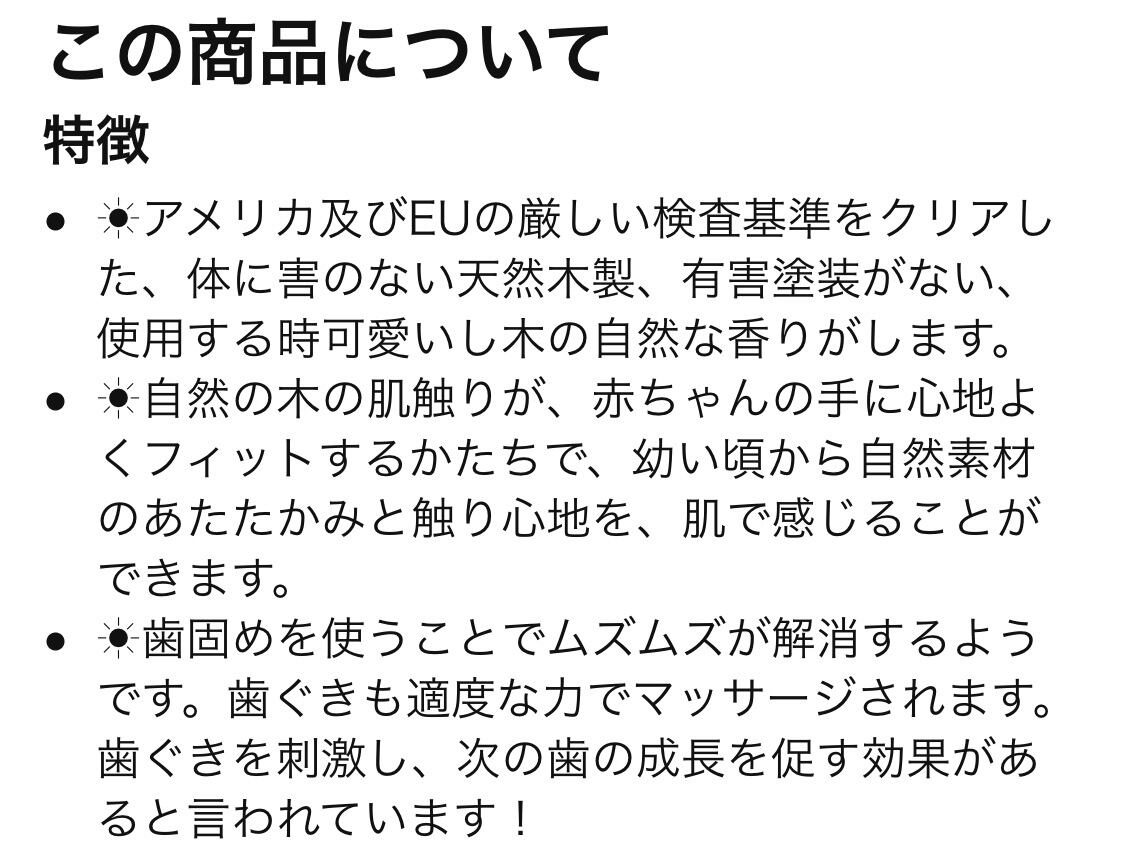 2枚目の写真の説明にもある様に、歯固めの木製リングはアメリカ及びEUの厳しい検査をクリアした体に害のない天然木製で、有害塗装も無く安心な物を使用しています。